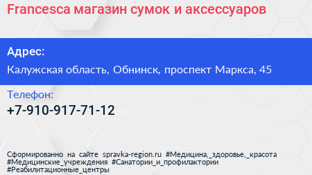Francesca, магазин сумок и аксессуаров по адресу Калужская область, Обнинск, проспект Маркса, 45 в дальнейшем Организация, размещена в следующих категориях: