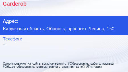 Garderob по адресу Калужская область, Обнинск, проспект Ленина, 150 в дальнейшем Организация, размещена в следующих категориях:
