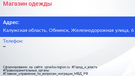Магазин одежды по адресу Калужская область, Обнинск, Железнодорожная улица, 6 в дальнейшем Организация, размещена в следующих категориях: