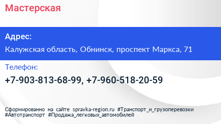 Мастерская по адресу Калужская область, Обнинск, проспект Маркса, 71 в дальнейшем Организация, размещена в следующих категориях: