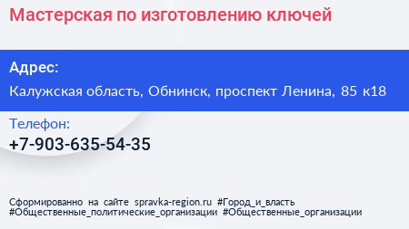 Мастерская по изготовлению ключей по адресу Калужская область, Обнинск, проспект Ленина, 85 к18 в дальнейшем Организация, размещена в следующих категориях: