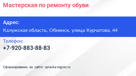 Мастерская по ремонту обуви по адресу Калужская область, Обнинск, улица Курчатова, 44 в дальнейшем Организация, размещена в следующих категориях: