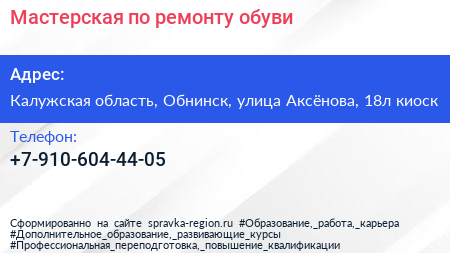 Мастерская по ремонту обуви по адресу Калужская область, Обнинск, улица Аксёнова, 18л киоск в дальнейшем Организация, размещена в следующих категориях: