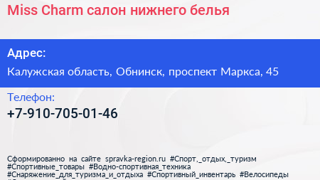 Miss Charm, салон нижнего белья по адресу Калужская область, Обнинск, проспект Маркса, 45 в дальнейшем Организация, размещена в следующих категориях: