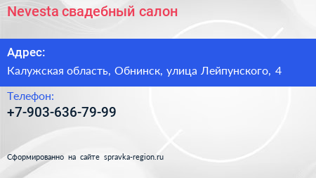 Nevesta, свадебный салон по адресу Калужская область, Обнинск, улица Лейпунского, 4 в дальнейшем Организация, размещена в следующих категориях: