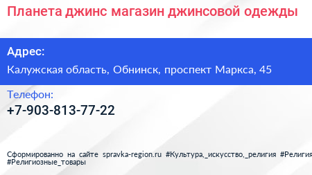 Планета джинс, магазин джинсовой одежды по адресу Калужская область, Обнинск, проспект Маркса, 45 в дальнейшем Организация, размещена в следующих категориях: