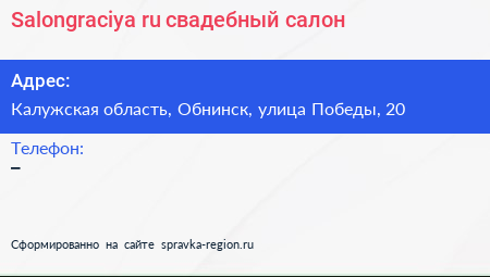 Salongraciya.ru, свадебный салон по адресу Калужская область, Обнинск, улица Победы, 20 в дальнейшем Организация, размещена в следующих категориях: