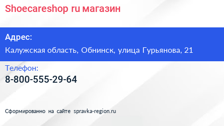 Shoecareshop.ru, магазин по адресу Калужская область, Обнинск, улица Гурьянова, 21 в дальнейшем Организация, размещена в следующих категориях: