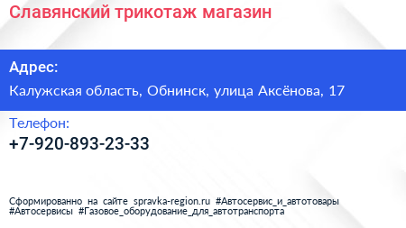 Славянский трикотаж, магазин по адресу Калужская область, Обнинск, улица Аксёнова, 17 в дальнейшем Организация, размещена в следующих категориях: