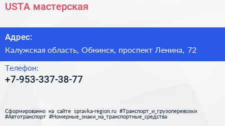USTA, мастерская по адресу Калужская область, Обнинск, проспект Ленина, 72 в дальнейшем Организация, размещена в следующих категориях: