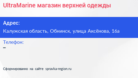 UltraMarine, магазин верхней одежды по адресу Калужская область, Обнинск, улица Аксёнова, 16а в дальнейшем Организация, размещена в следующих категориях: