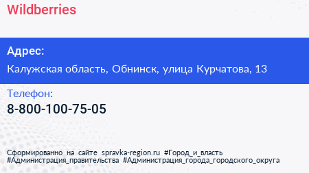 Wildberries по адресу Калужская область, Обнинск, улица Курчатова, 13 в дальнейшем Организация, размещена в следующих категориях: