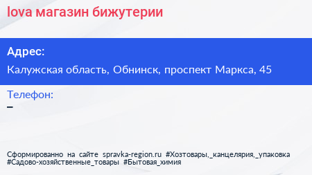 lova, магазин бижутерии по адресу Калужская область, Обнинск, проспект Маркса, 45 в дальнейшем Организация, размещена в следующих категориях: