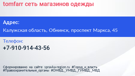 tomfarr, сеть магазинов одежды по адресу Калужская область, Обнинск, проспект Маркса, 45 в дальнейшем Организация, размещена в следующих категориях: