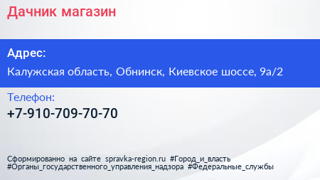 Дачник, магазин по адресу Калужская область, Обнинск, Киевское шоссе, 9а/2 в дальнейшем Организация, размещена в следующих категориях: