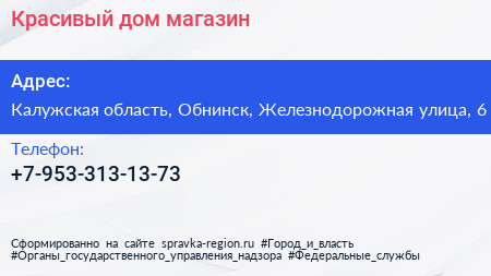 Красивый дом, магазин по адресу Калужская область, Обнинск, Железнодорожная улица, 6 в дальнейшем Организация, размещена в следующих категориях: