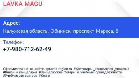 LAVKA MAGU по адресу Калужская область, Обнинск, проспект Маркса, 8 в дальнейшем Организация, размещена в следующих категориях: