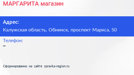 МАРГАРИТА, магазин по адресу Калужская область, Обнинск, проспект Маркса, 50 в дальнейшем Организация, размещена в следующих категориях: