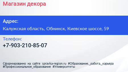 Магазин декора по адресу Калужская область, Обнинск, Киевское шоссе, 59 в дальнейшем Организация, размещена в следующих категориях: