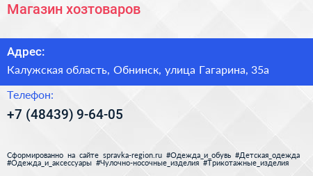 Магазин хозтоваров по адресу Калужская область, Обнинск, улица Гагарина, 35а в дальнейшем Организация, размещена в следующих категориях: