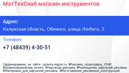 МатТехСнаб, магазин инструментов по адресу Калужская область, Обнинск, улица Любого, 5 в дальнейшем Организация, размещена в следующих категориях: