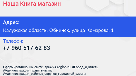 Наша Книга, магазин по адресу Калужская область, Обнинск, улица Комарова, 1 в дальнейшем Организация, размещена в следующих категориях: