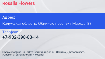 Rosalia Flowers по адресу Калужская область, Обнинск, проспект Маркса, 89 в дальнейшем Организация, размещена в следующих категориях: