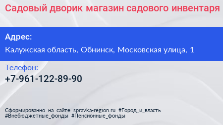 Садовый дворик, магазин садового инвентаря по адресу Калужская область, Обнинск, Московская улица, 1 в дальнейшем Организация, размещена в следующих категориях: