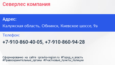 Северлес, компания по адресу Калужская область, Обнинск, Киевское шоссе, 9а в дальнейшем Организация, размещена в следующих категориях: