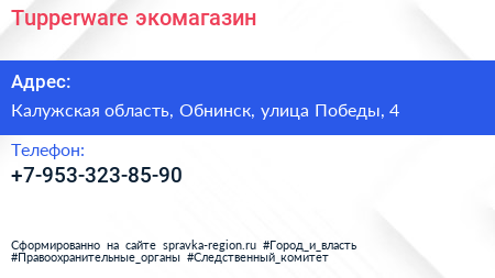 Tupperware, экомагазин по адресу Калужская область, Обнинск, улица Победы, 4 в дальнейшем Организация, размещена в следующих категориях: