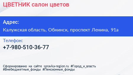 ЦВЕТНИК, салон цветов по адресу Калужская область, Обнинск, проспект Ленина, 91а в дальнейшем Организация, размещена в следующих категориях: