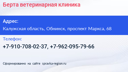 Берта, ветеринарная клиника по адресу Калужская область, Обнинск, проспект Маркса, 68 в дальнейшем Организация, размещена в следующих категориях:
