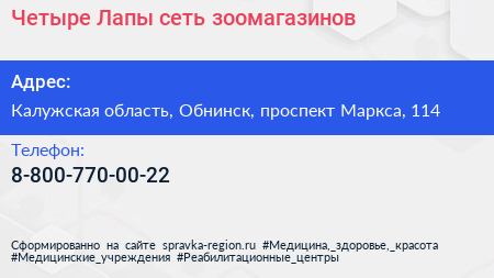 Четыре Лапы, сеть зоомагазинов по адресу Калужская область, Обнинск, проспект Маркса, 114 в дальнейшем Организация, размещена в следующих категориях: