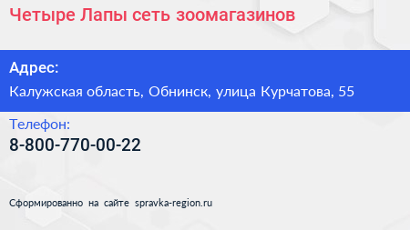Четыре Лапы, сеть зоомагазинов по адресу Калужская область, Обнинск, улица Курчатова, 55 в дальнейшем Организация, размещена в следующих категориях: