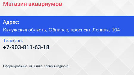 Магазин аквариумов по адресу Калужская область, Обнинск, проспект Ленина, 104 в дальнейшем Организация, размещена в следующих категориях: