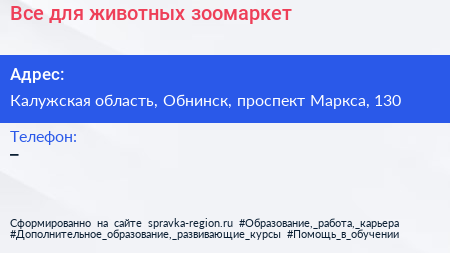 Все для животных, зоомаркет по адресу Калужская область, Обнинск, проспект Маркса, 130 в дальнейшем Организация, размещена в следующих категориях: