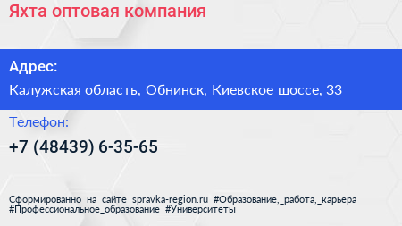 Яхта, оптовая компания по адресу Калужская область, Обнинск, Киевское шоссе, 33 в дальнейшем Организация, размещена в следующих категориях: