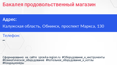 Бакалея, продовольственный магазин по адресу Калужская область, Обнинск, проспект Маркса, 130 в дальнейшем Организация, размещена в следующих категориях: