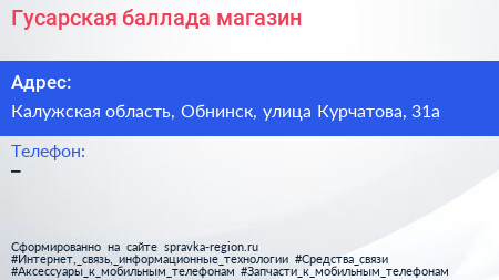 Гусарская баллада, магазин по адресу Калужская область, Обнинск, улица Курчатова, 31а в дальнейшем Организация, размещена в следующих категориях: