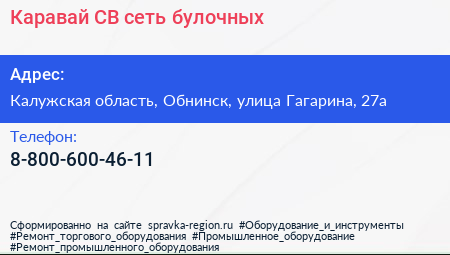 Каравай СВ, сеть булочных по адресу Калужская область, Обнинск, улица Гагарина, 27а в дальнейшем Организация, размещена в следующих категориях: