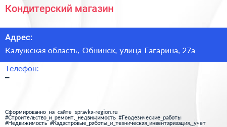 Кондитерский магазин по адресу Калужская область, Обнинск, улица Гагарина, 27а в дальнейшем Организация, размещена в следующих категориях: