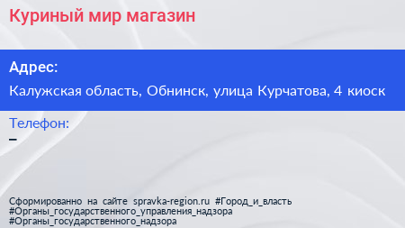 Куриный мир, магазин по адресу Калужская область, Обнинск, улица Курчатова, 4 киоск в дальнейшем Организация, размещена в следующих категориях: