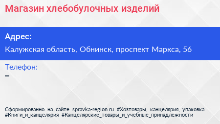 Магазин хлебобулочных изделий по адресу Калужская область, Обнинск, проспект Маркса, 56 в дальнейшем Организация, размещена в следующих категориях: