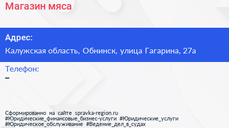 Магазин мяса по адресу Калужская область, Обнинск, улица Гагарина, 27а в дальнейшем Организация, размещена в следующих категориях: