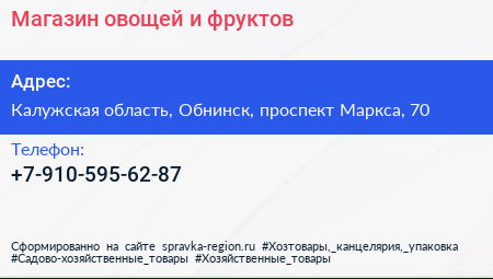 Магазин овощей и фруктов по адресу Калужская область, Обнинск, проспект Маркса, 70 в дальнейшем Организация, размещена в следующих категориях: