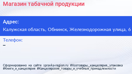 Магазин табачной продукции по адресу Калужская область, Обнинск, Железнодорожная улица, 6 в дальнейшем Организация, размещена в следующих категориях: