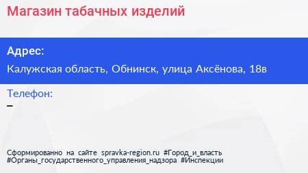 Магазин табачных изделий по адресу Калужская область, Обнинск, улица Аксёнова, 18в в дальнейшем Организация, размещена в следующих категориях:
