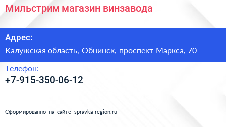 Мильстрим, магазин винзавода по адресу Калужская область, Обнинск, проспект Маркса, 70 в дальнейшем Организация, размещена в следующих категориях: