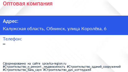 Оптовая компания по адресу Калужская область, Обнинск, улица Королёва, 6 в дальнейшем Организация, размещена в следующих категориях: