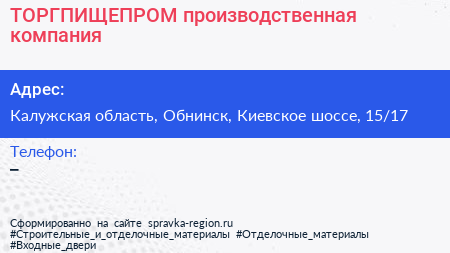 ТОРГПИЩЕПРОМ, производственная компания по адресу Калужская область, Обнинск, Киевское шоссе, 15/17 в дальнейшем Организация, размещена в следующих категориях: